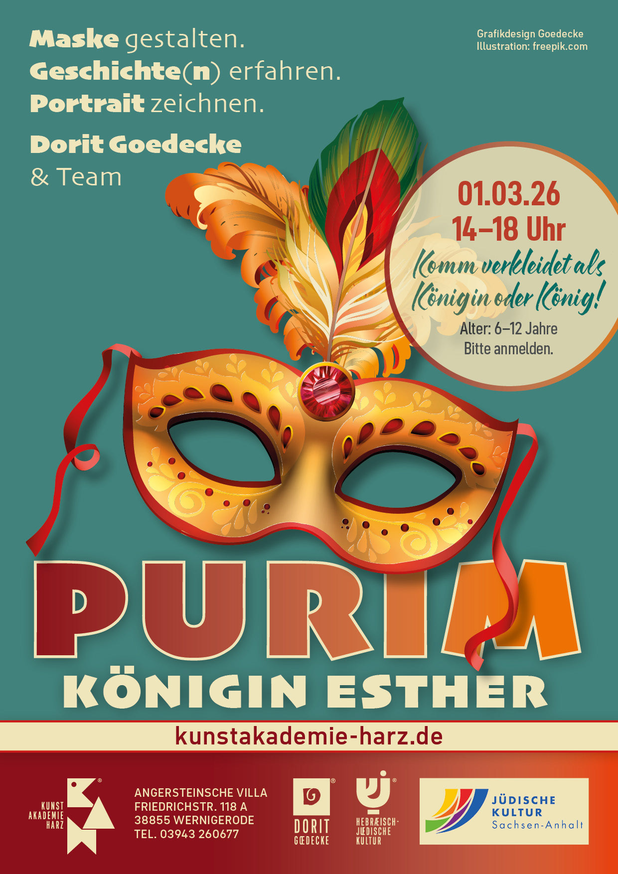 Einen kreativen Workshop für Kinder ab 6 Jahre gestaltet die Kunstakademie Harz am Vortag des jüdischen Festes zu Purim. Unter fachlicher Anleitung können interessierte Kinder eine Maske gestalten, eine Schriftrolle bauen, ein Portrait zeichnen, sich schminken lassen oder selber schminken und traditionell einer Purimgeschichte für Kinder lauschen. Die handelt vom Mut der persischen Königin Esther, die Jüdin war. Sie stand gegen das Unrecht ihrer Zeit auf und rettete dadurch das Leben ihres ganzen Volkes. Das Purimfest wird seit über 2000 Jahren als Erinnerung an dieses Ereignis gefeiert. Es basiert auf der biblischen Esther-Geschichte aus dem 5. Jahrhundert vor Christus.